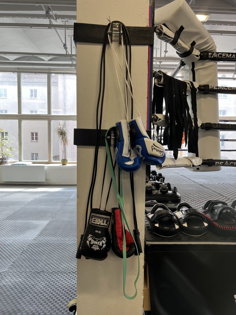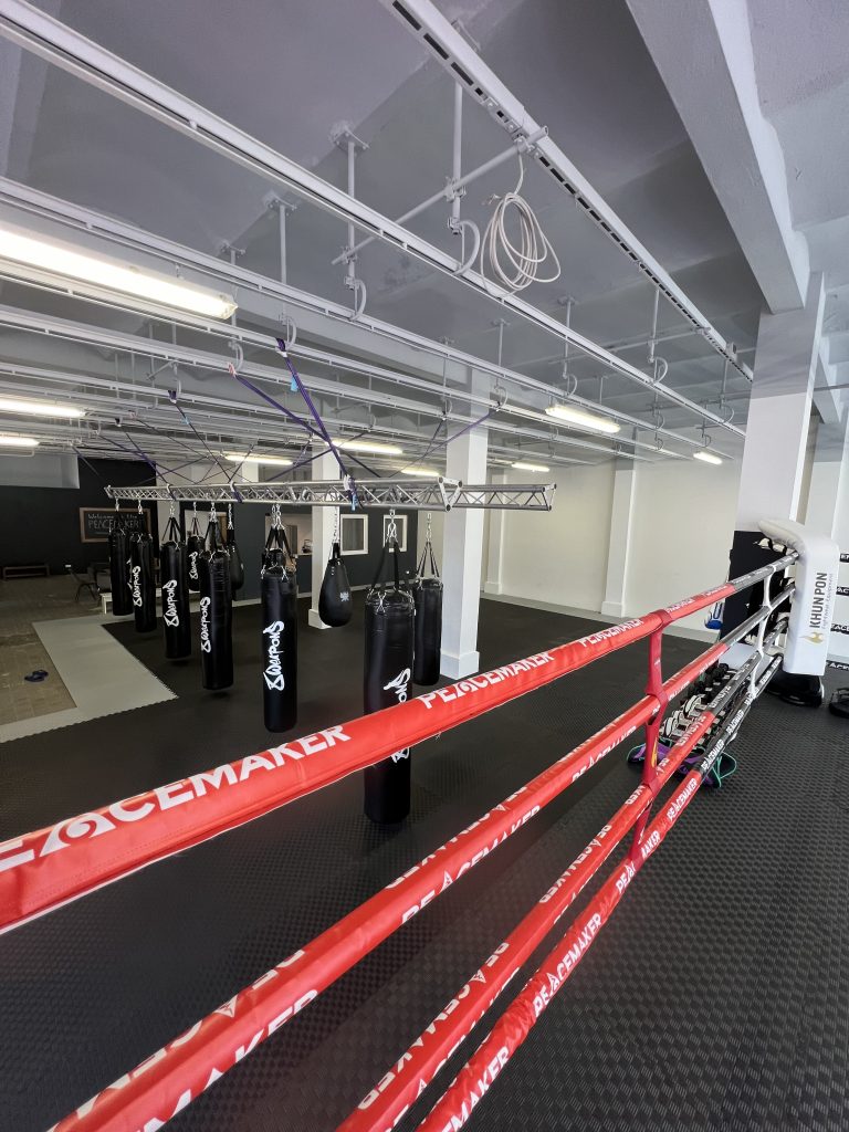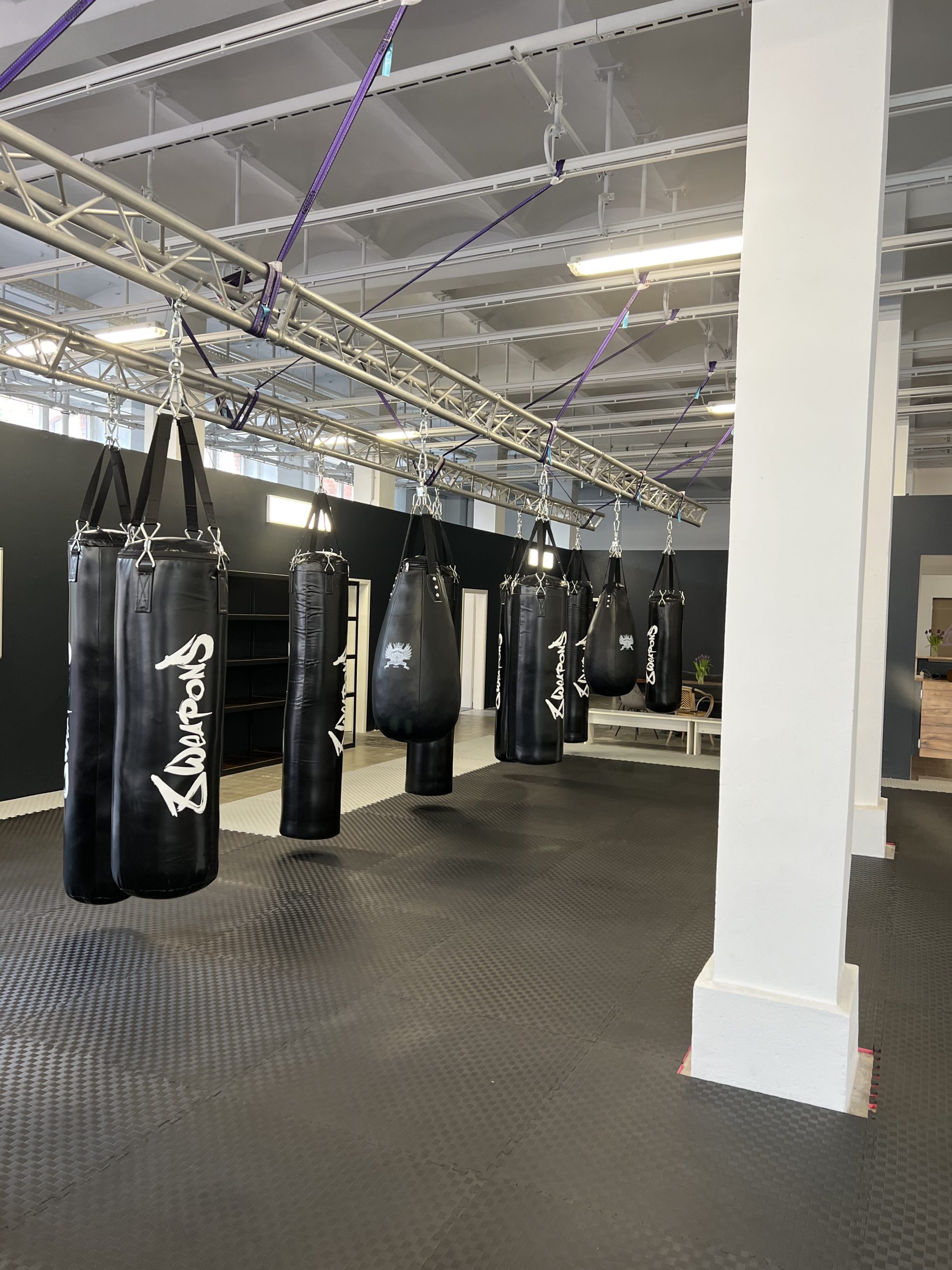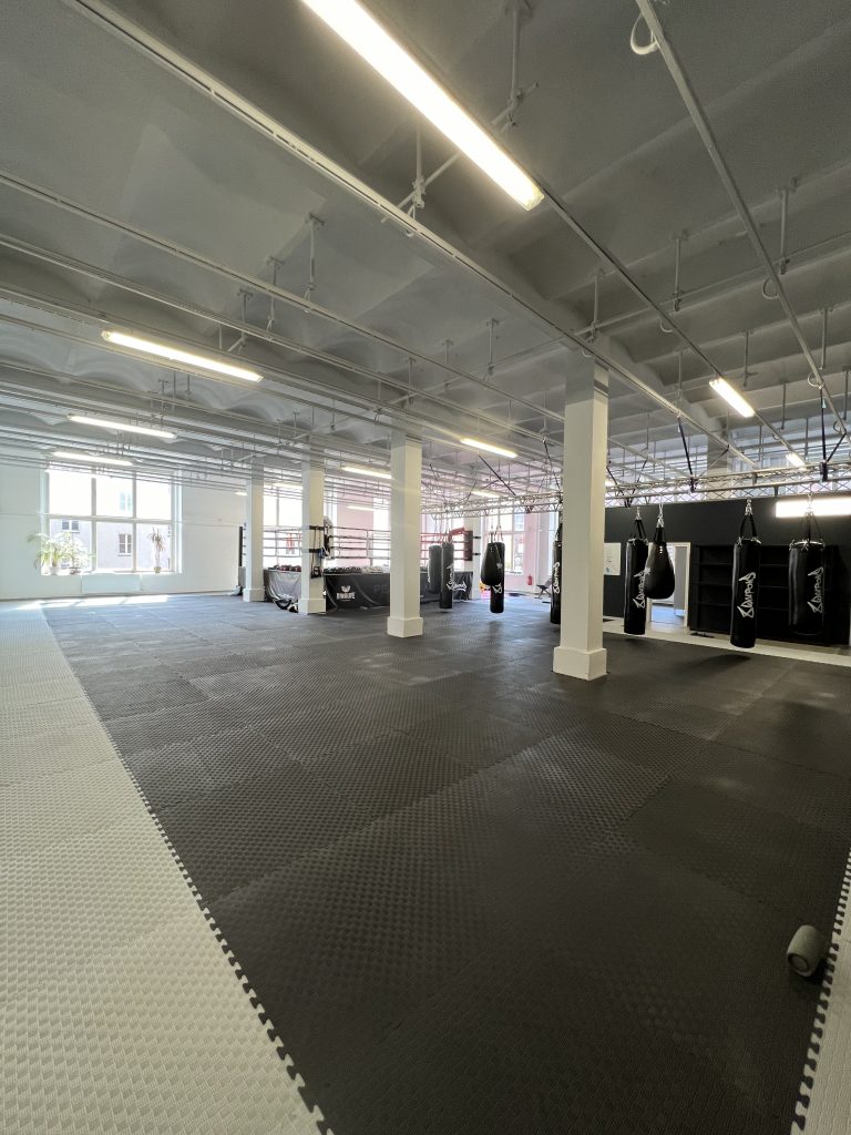 Trainiert wird auf einer großen, hellen Mattenfläche – mit vielen Sandsäcken, einer Fitnessarea und einem echten Hochring für authentisches Kampfsport-Feeling.