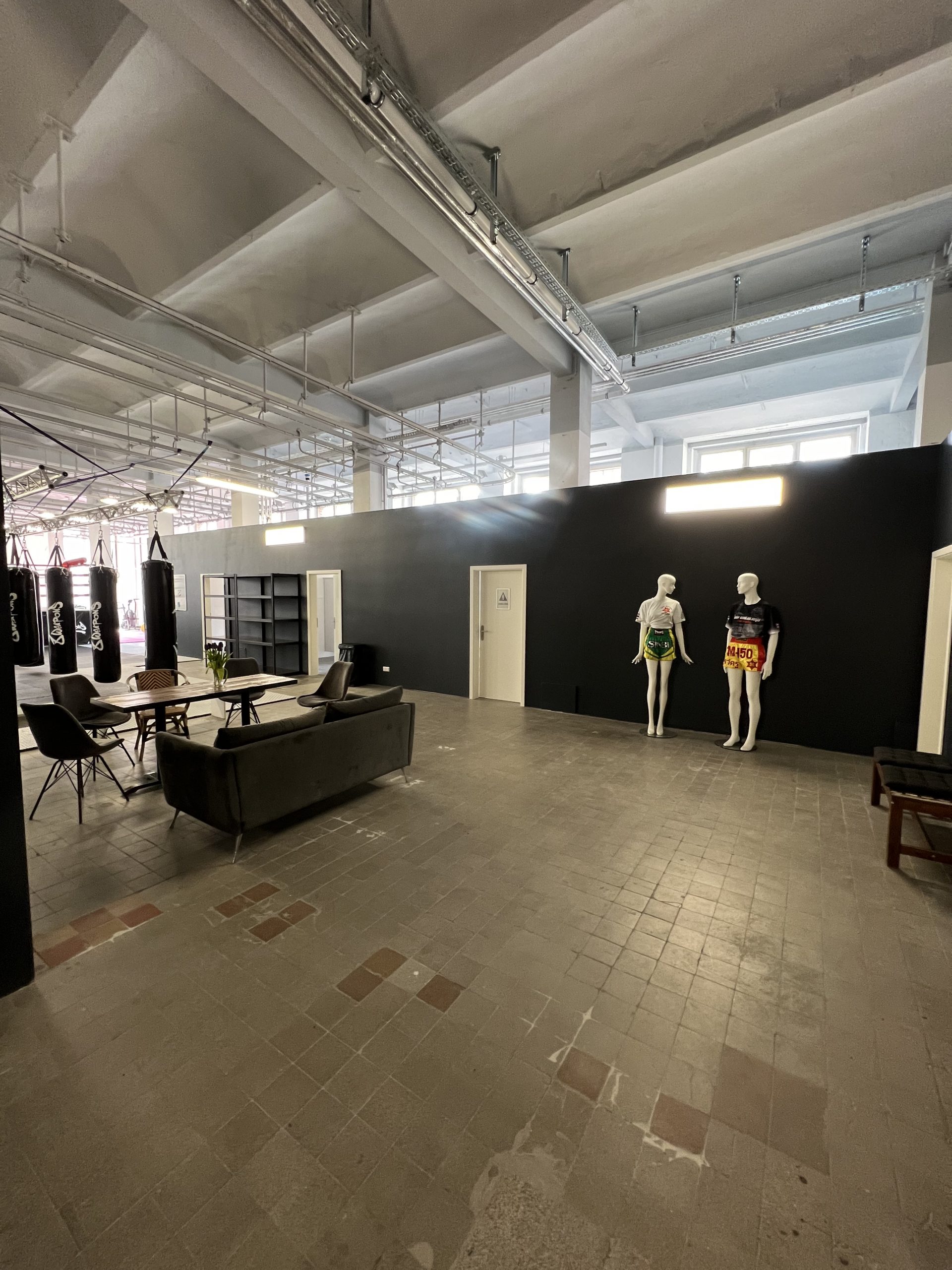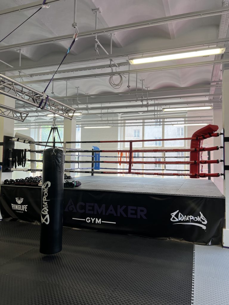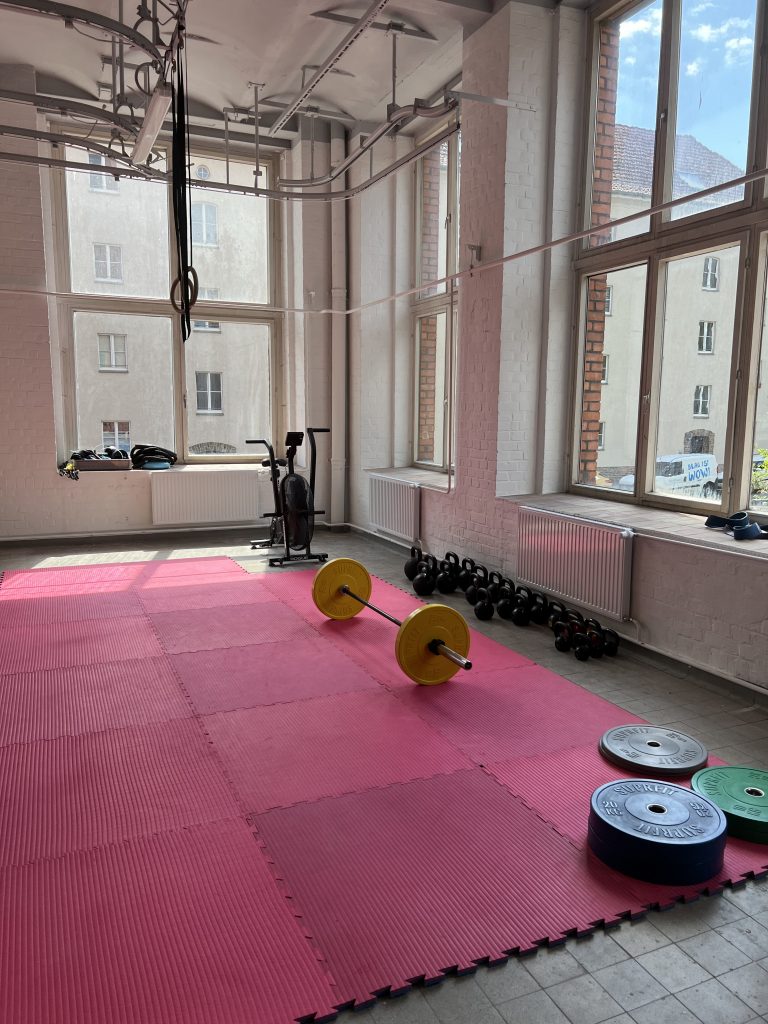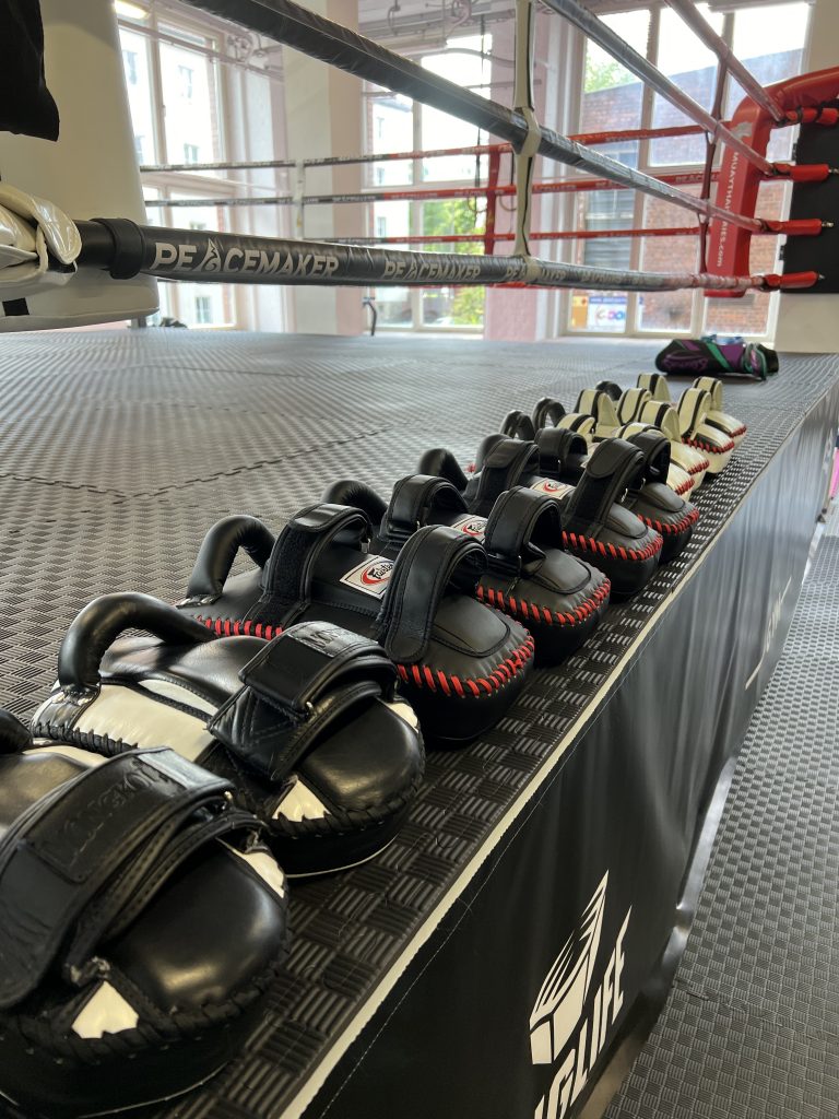 Trainiert wird auf einer großen, hellen Mattenfläche – mit vielen Sandsäcken, einer Fitnessarea und einem echten Hochring für authentisches Kampfsport-Feeling.